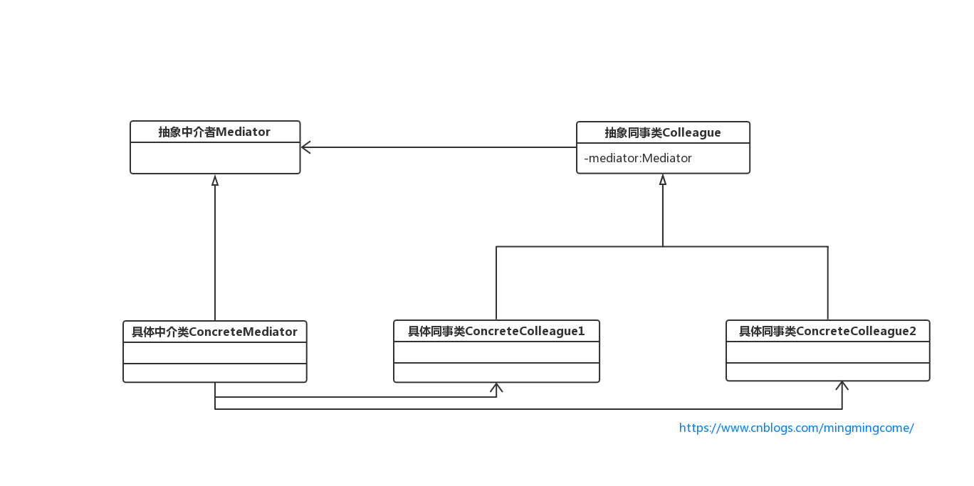 - (4)具體同事類:實現抽象同事類,每個具體同事對象只知道自己的行為,而不了解其他同事對象的情況,但它們都認識中介者。