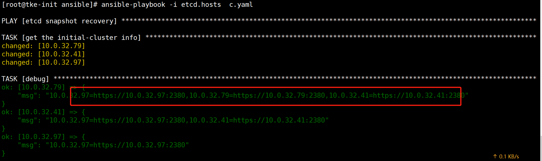 在用ansible撰寫一個etcd恢復的playbook時,有一個操作是獲取etcd啟動時的”initial-cluster”啟動參數,該參數在etcd集群不同節點不一致,需要取出etcd節點啟動參數中最長的作為etcdctl snapshot restore的參數。