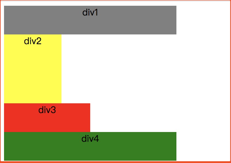 同樣我們可以很直觀的看到,因為div2和div3目前都是左浮動,所以它們的位置都空出來了,這個時候div4就可以往上移動,所以div2和div3都把div4部分給覆蓋了。