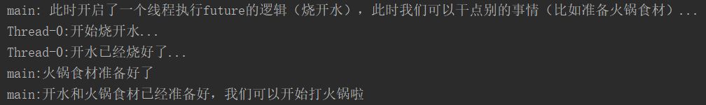 System.out.println(Thread.currentThread().getName() + ":" + " 此時開啟了一個線程執行future的邏輯(燒開水),此時我們可以干點別的事情(比如準備火鍋食材)...");