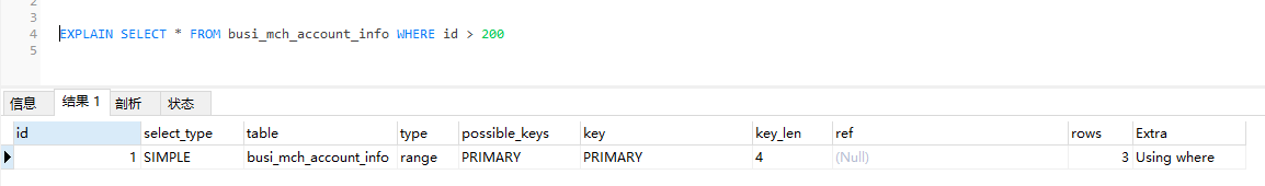 當 type 是 range 時,那麼 EXPLAIN 輸出的 ref 字段為 NULL,並且 key_len 字段是此次查詢中使用到的索引的最長的那個 。