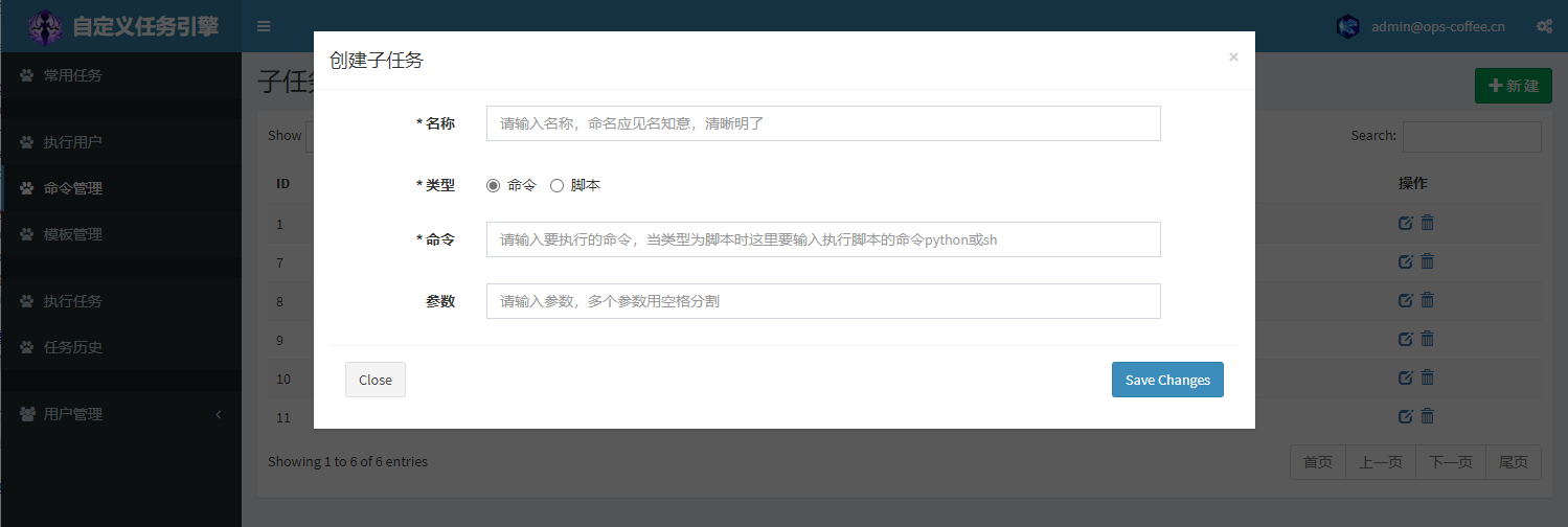 這界面主要給運維人員使用,定義任務名稱、所要執行的模板ID、以及參數,支持定時執行或者周期執行,只需要加上crontab參數即可,除了可以立即執行任務外,還可以將次任務保存為常用任務,後續在常用任務頁面可以直接執行