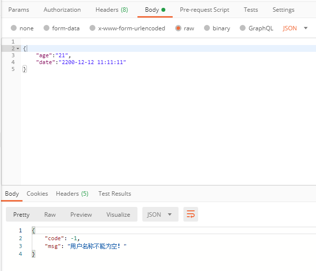 controller層這裏只需要在實體類的前面加上@Valid註解,這個註解可以實現數據的驗證。這裏BindingResult是存儲了校驗時的錯誤信息,驗證有誤時將錯誤信息返回給前端。這裏不使用BindingResult的時候,控制台會報MethodArgumentNotValidException,這裏可以通過自定義異常類來捕捉它,然後去掉BindingResult,以及難看的if判斷。